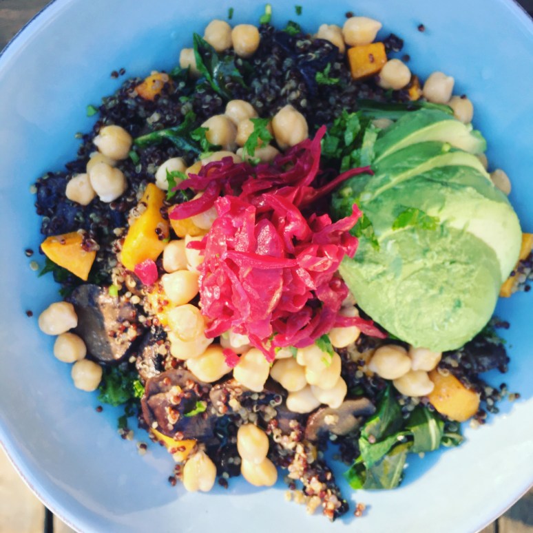 I finely cut kale- a variety is nice but you use can use any single variety. Give it a little massage with a dash of olive oil, lemon and salt. I top the kale with warm quinoa, roasted squash (insert any root veggie), mushrooms and chickpeas, It’s seasoned with salt, olive oil and lemon and topped here with red kraut, avocado and cilantro. I’m thinking a nice tahini, green goddess like dressing could be nice here too.